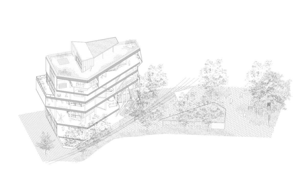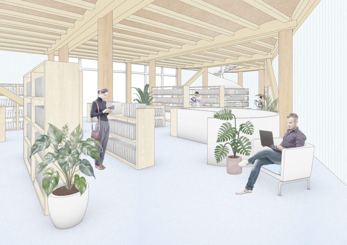 Dieser Entwurf entstand im Rahmen einer Aufgabe in Basel am Rande des Dreispitz Areal einen multifunktionalen öffentlichen Raum zu entwerfen, der nicht nur genügend Platz für eine Bibliothek beinhalten, sondern auch eine Plattform für Ausstellungen und Events bieten soll.