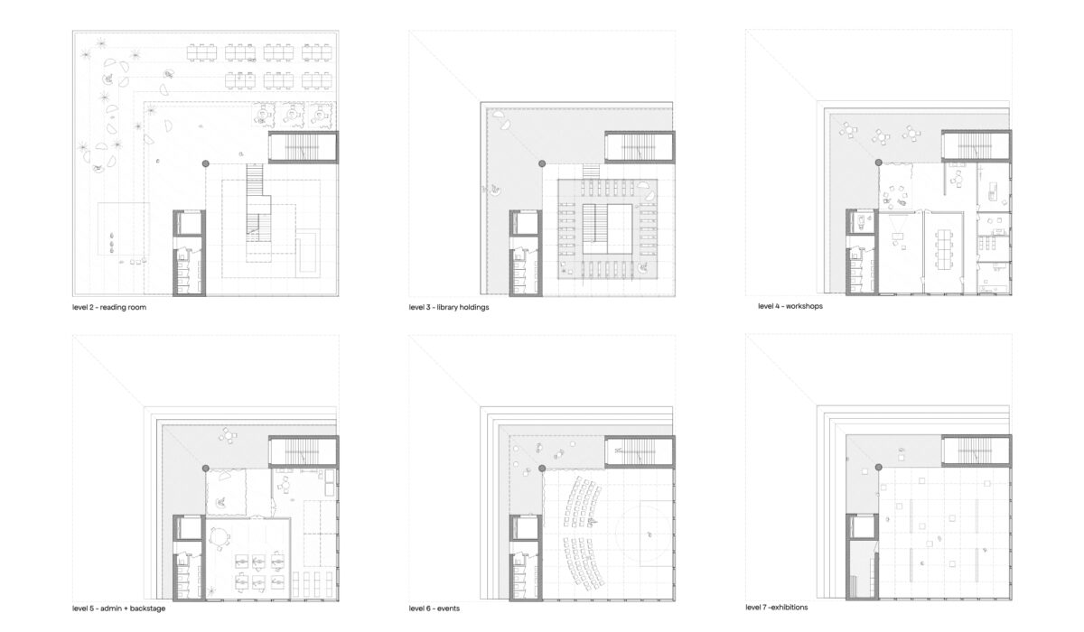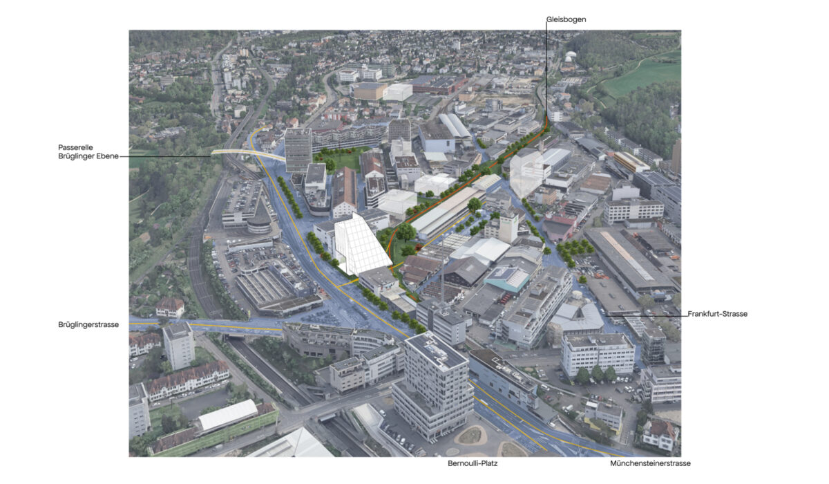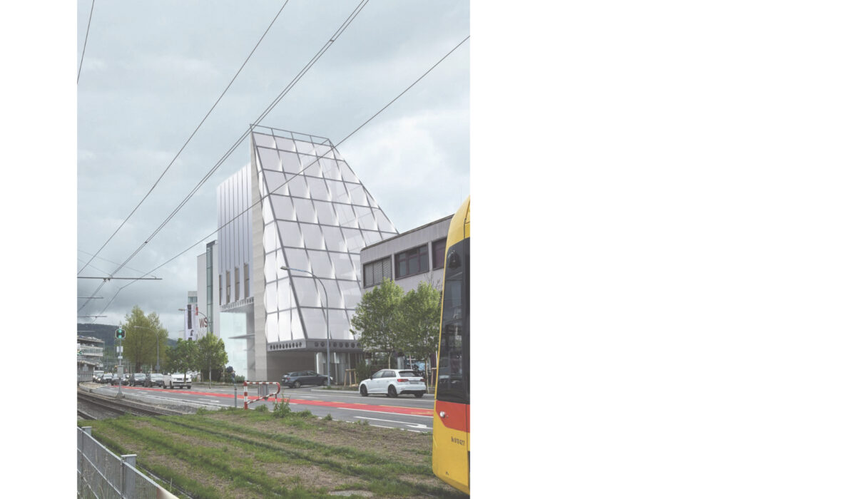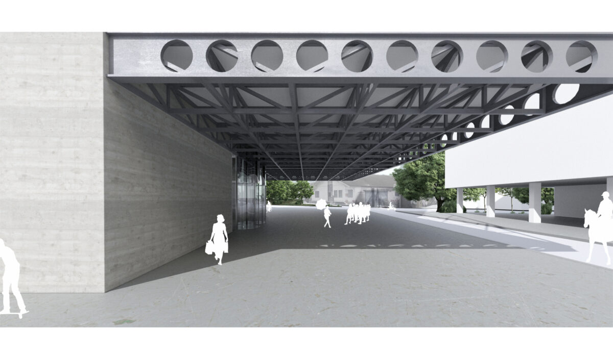 Dieser Vorschlag hebt den Lesesaal mittels einer abgehangenen Struktur über das Bodenniveau an, und schafft damit einen zunächst deutungsfreien öffentlichen Außenraum, der Druck von der fußgängerunfreundlichen Umgebung des postindustriellen Dreispitz nimmt, und der angestrebten Weiterentwicklung des Viertels mit einer großzügigen Geste entgegenkommt.
