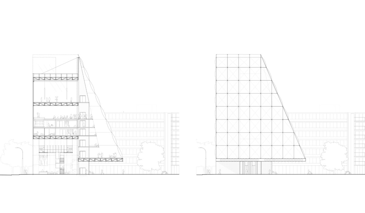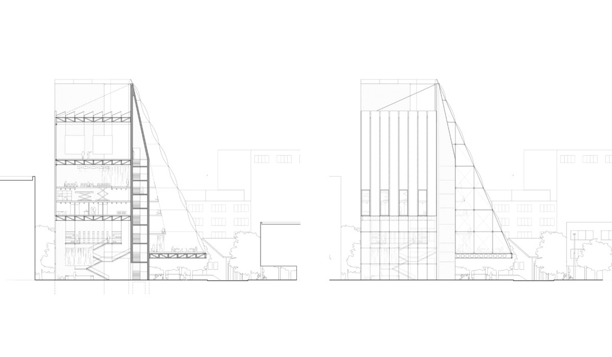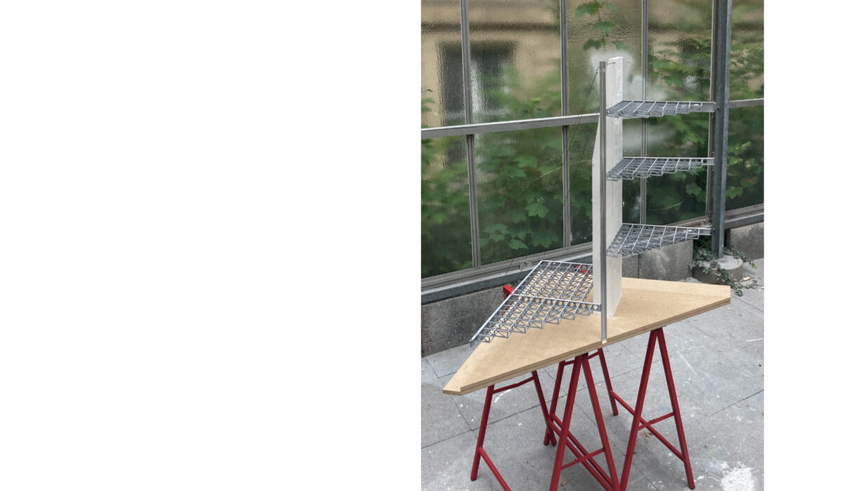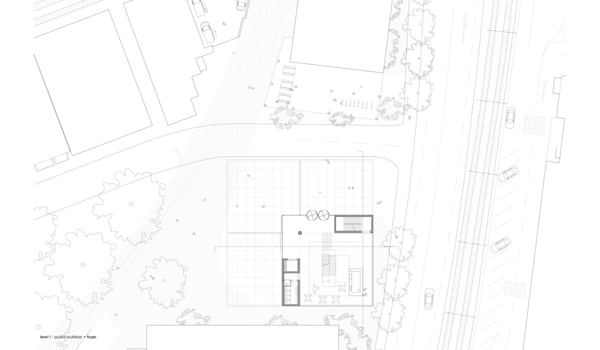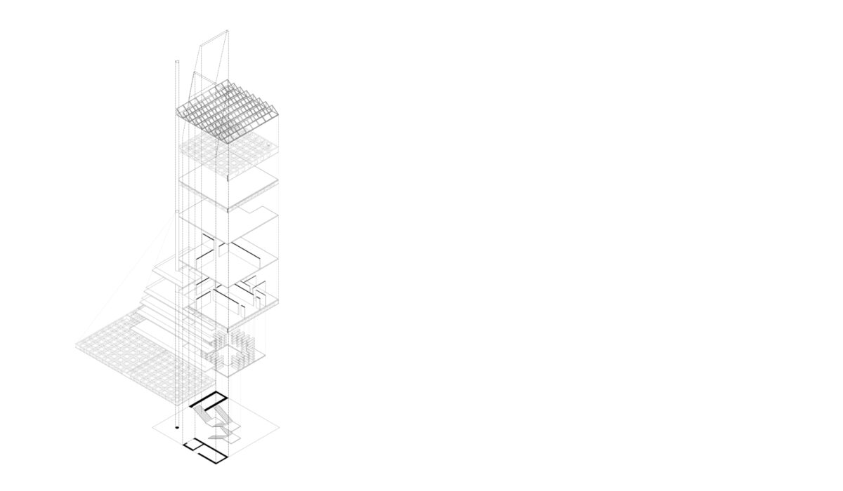 Dieser Vorschlag hebt den Lesesaal mittels einer abgehangenen Struktur über das Bodenniveau an, und schafft damit einen zunächst deutungsfreien öffentlichen Außenraum, der Druck von der fußgängerunfreundlichen Umgebung des postindustriellen Dreispitz nimmt, und der angestrebten Weiterentwicklung des Viertels mit einer großzügigen Geste entgegenkommt.