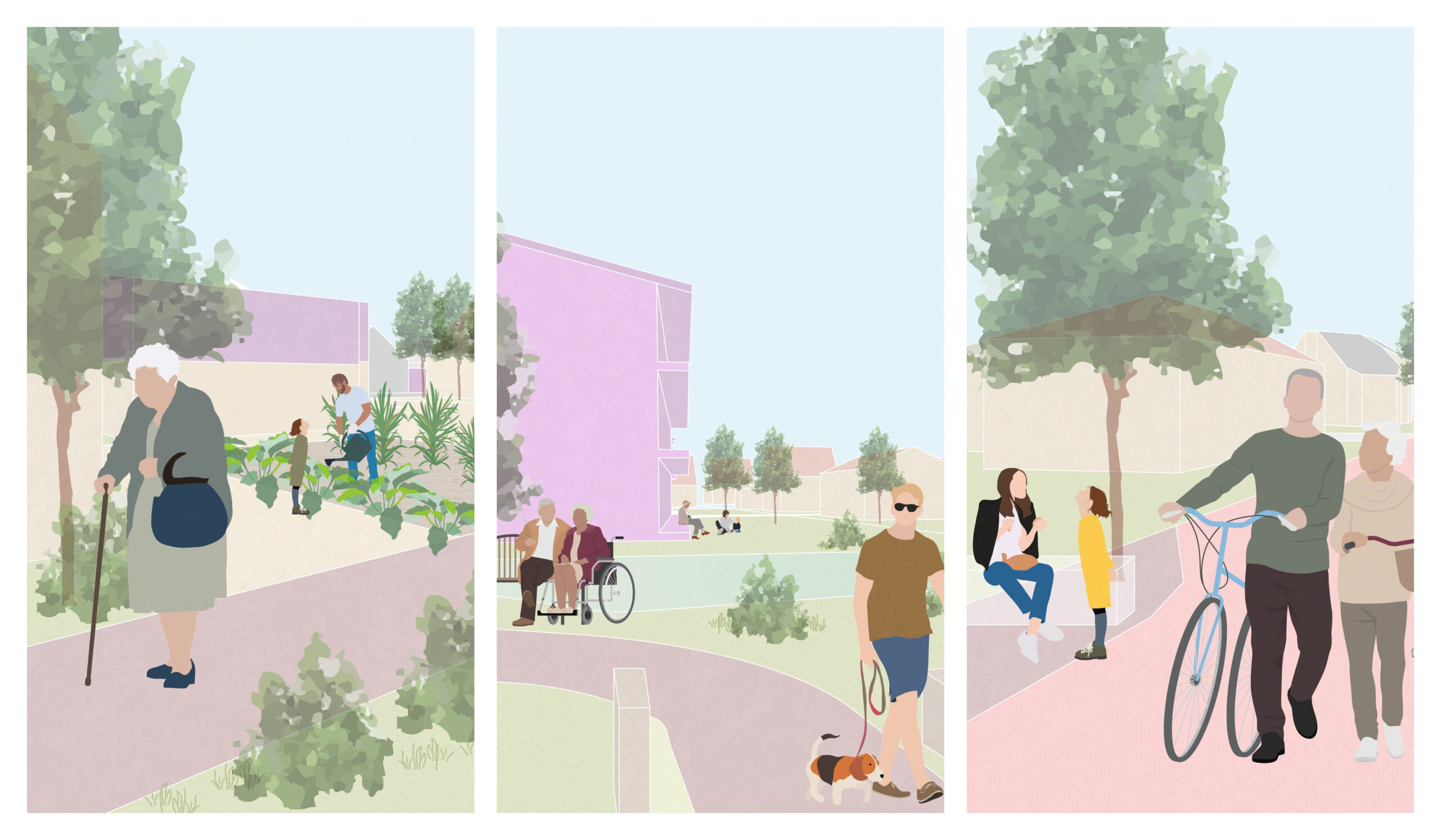 Im Zentrum steht die Transformation des nördlichen Siedlungsgebiets, durch Eingriffe in die Bestandsstruktur des verdichteten Einfamilienhausquartiers. Impulsprojekte auf unbebauten Flächen ergänzen den Bestand aus Ein- und Zweifamilienhäusern. Zusammengelegte Parzellen ermöglichen neue Wohnhöfe, die gemeinsam mit der Bewohnerschaft gestaltet werden. Zusätzliche Wege und angepasste Verkehrsräume verbessern die Durchwegung. Die konkrete Umsetzung und Varianten werden in Vertiefungsausschnitten genauer untersucht.